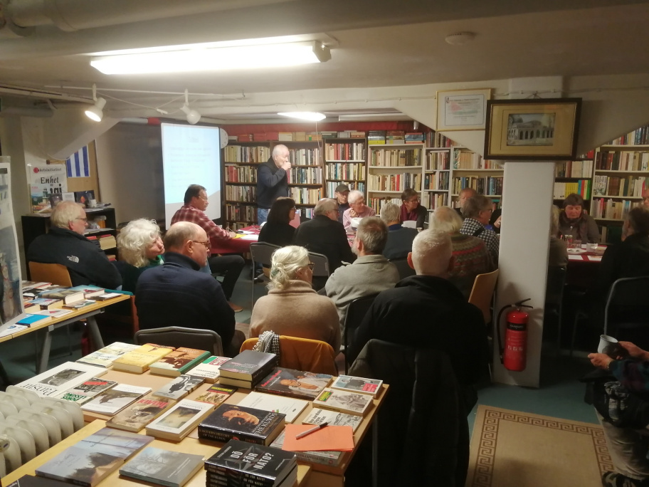 Varannan vecka har vi öppna diskussionsmöten i vår lokal. Alla är välkomna. Vi bjuder in en kunnig person som håller en inledning i engefär en timme och därefter diskuterar vi ämnet.